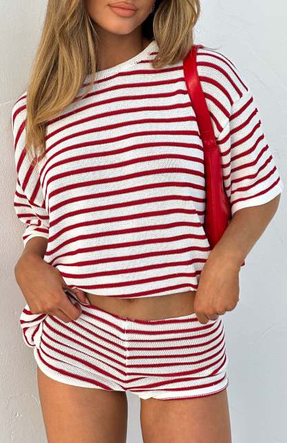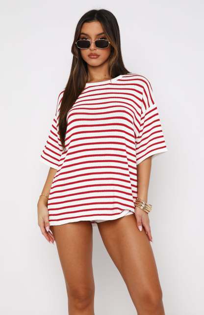 The All The Little Things Top Red Stripe is a must for your new season lounge collection. Features an over-sized look, no lining, slightly sheer, stretch material for an easy slip on design and full length. Style with All The Little Things Shorts and your favourite pair of sneakers for a cozy vibe!