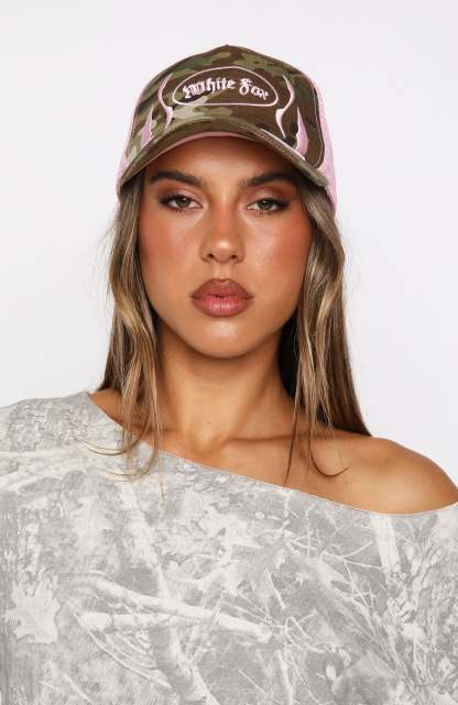 Cool girl vibes only in the Brooks Trucker Cap in Camo/Pink! Features embroidered White Fox text paired with embroidered flame graphic, camo design, mesh back and adjustable closure. We love this paired with one of our mix match festival fits!