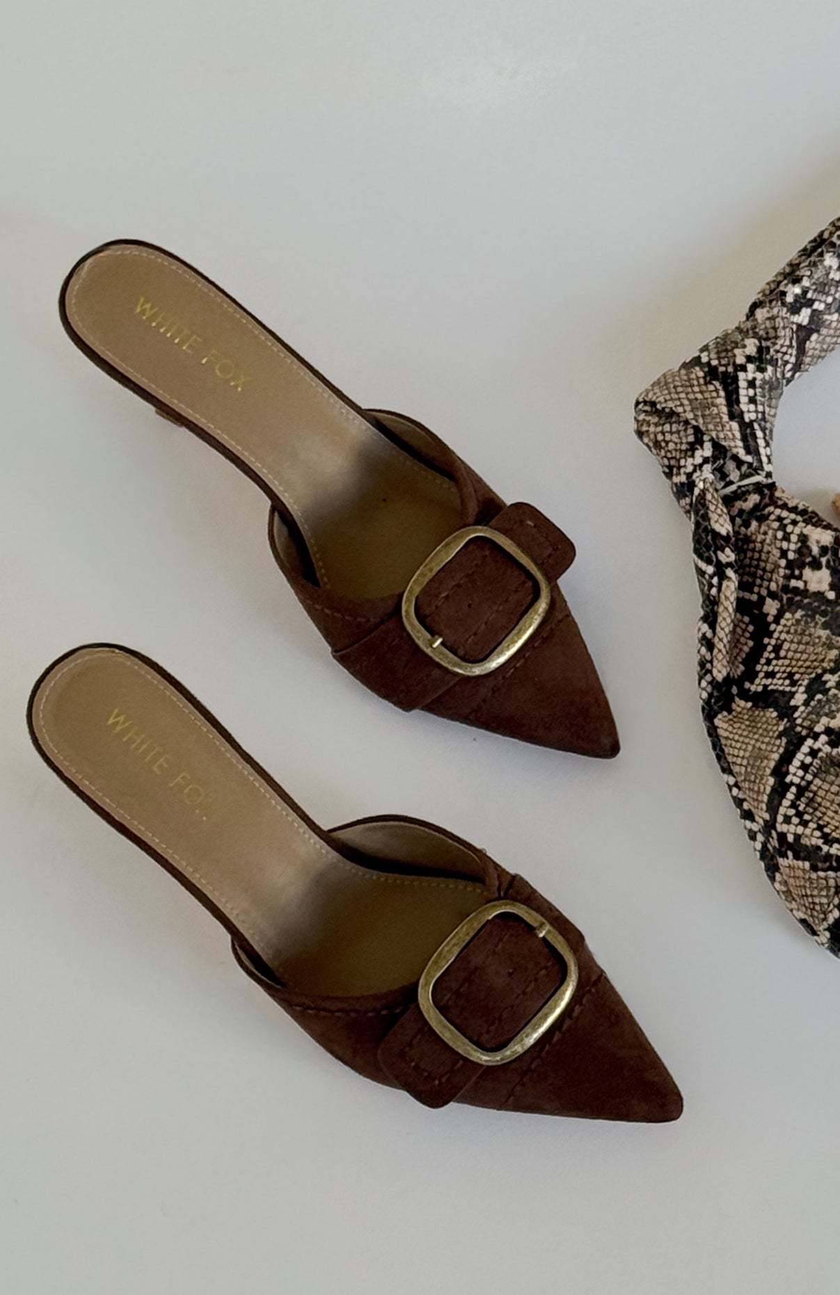 Capsule wardrobe staple! The Gino Mules Chocolate Faux Suede features a sleek pointed closed toe, a golden buckle detail, and a chic kitten heel, these mules effortlessly elevate any outfit. Slip them on for a polished look that transitions seamlessly from day to night.