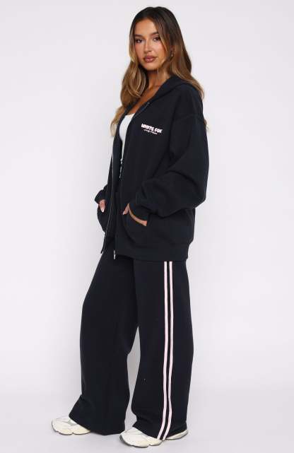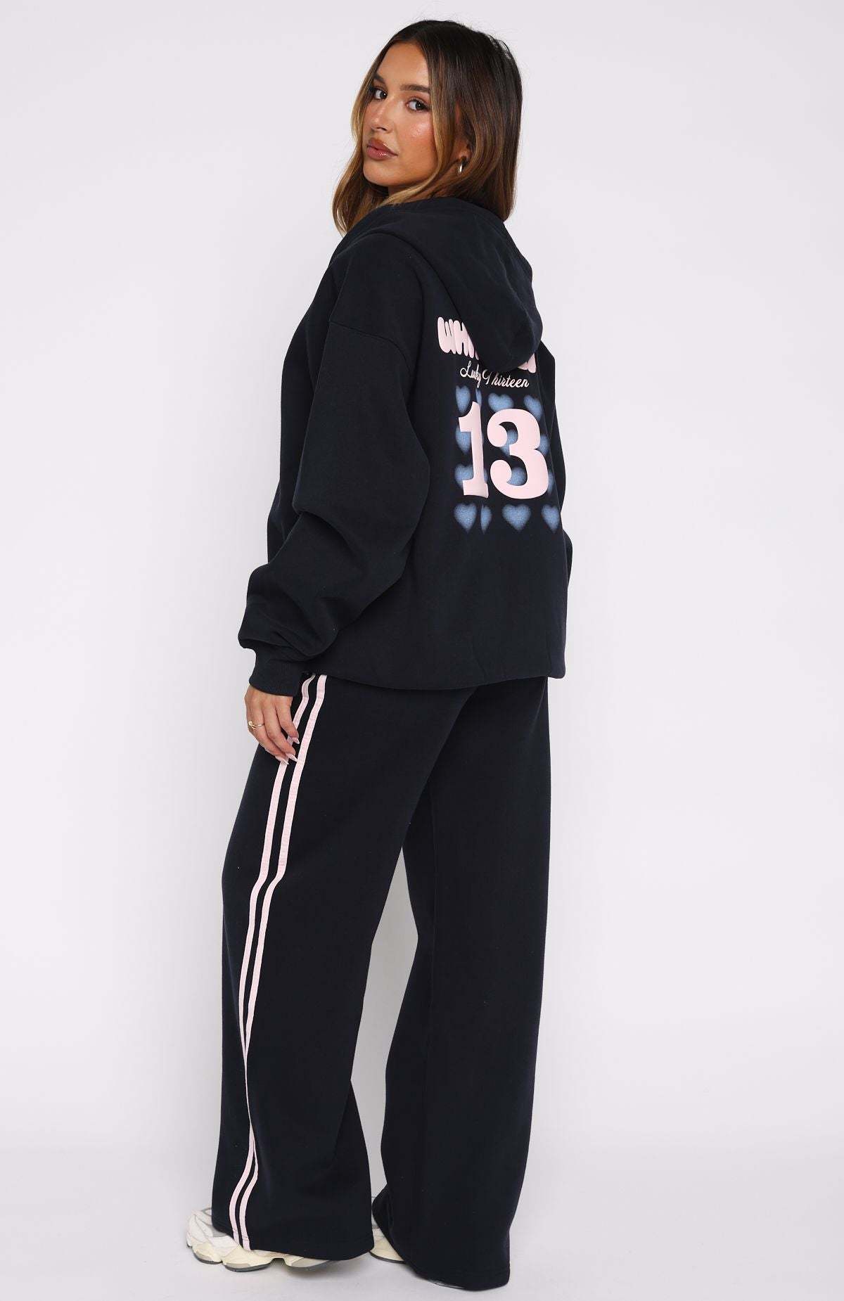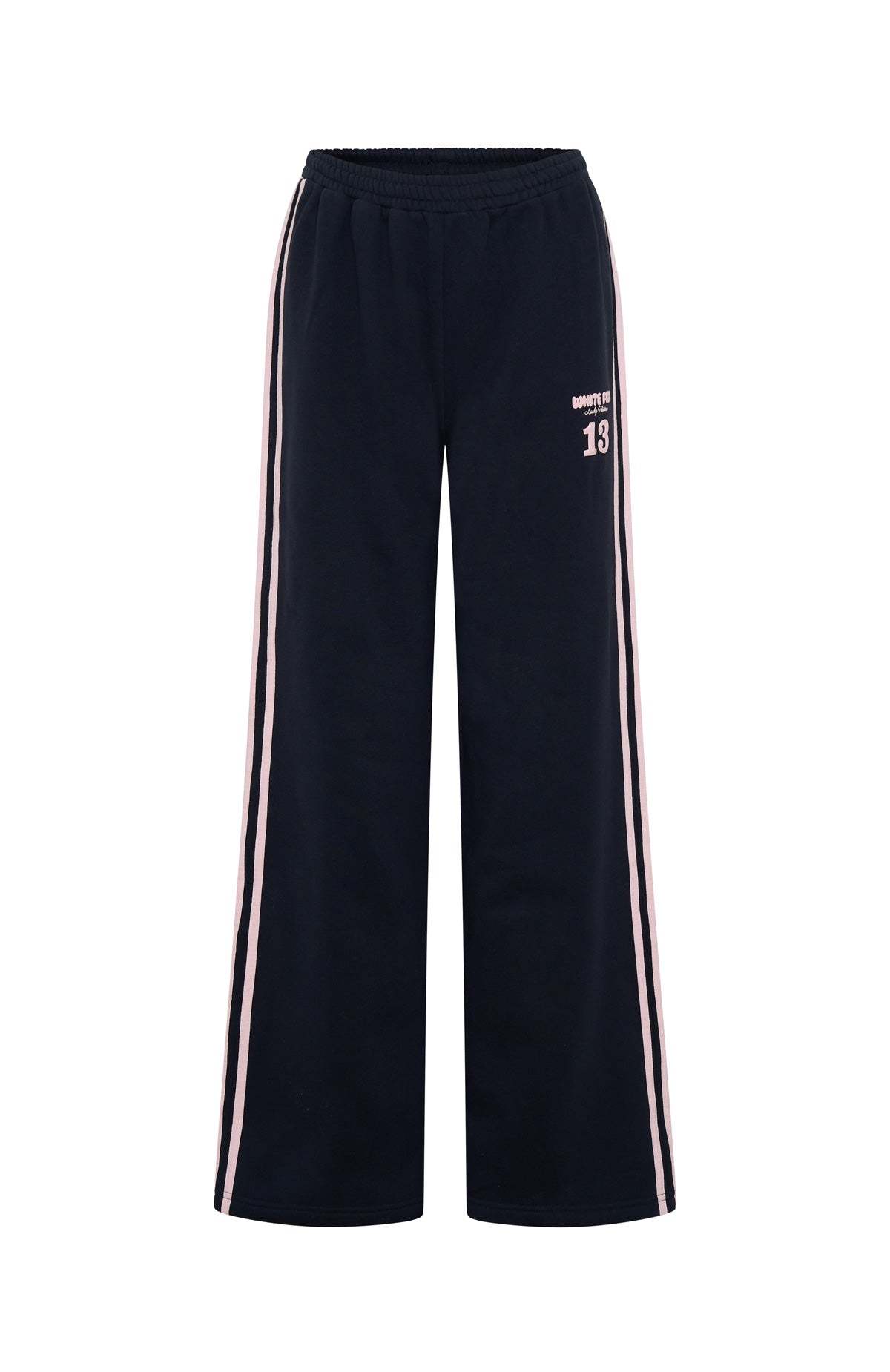 Lounge szn incoming! Introducing the Lucky Thirteen Charise Wide Leg Sweatpants Navy. Designed with a thick elasticated waistband, internal drawstring tie, and a wide-leg silhouette featuring double strip detailing. The White Fox puff-print text at the side adds a signature touch, while the unlined fleece interior ensures a cozy feel. Complete the look by pairing with the Lucky Thirteen Charise Zip Front Hoodie.