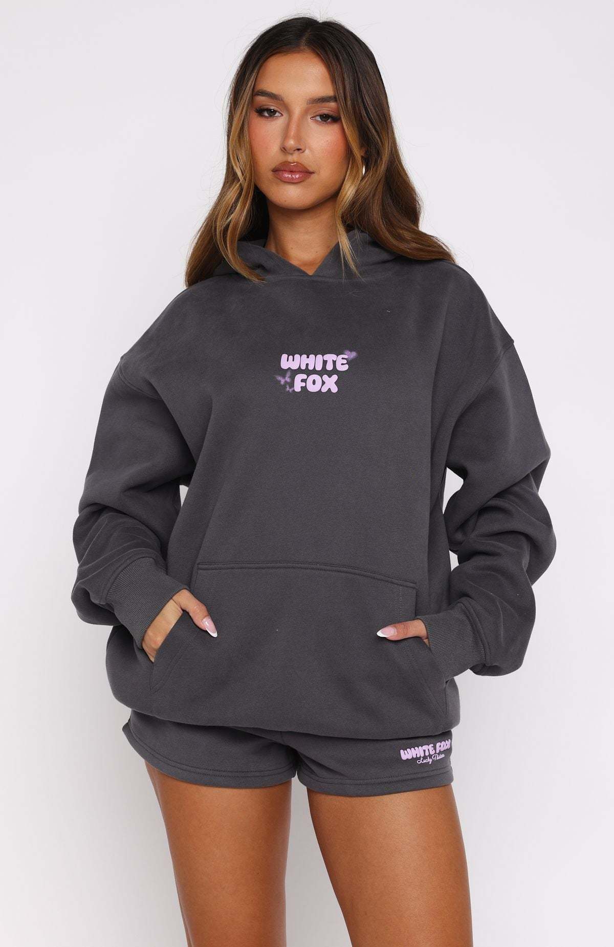 Play your cards right when styling the Lucky Thirteen Stephanie Oversized Hoodie in Volcanic! Designed with a relaxed hood, slouched shoulders and ribbed hems which round out an oversized silhouette. Featuring long sleeves, a roomy front pocket, and an unlined fleece interior, this hoodie delivers a cozy feel. White Fox puff‑print text embellishes the centre front and back, paired with a printed graphic. Style with the matching Lucky Thirteen Stephanie Lounge Shorts.