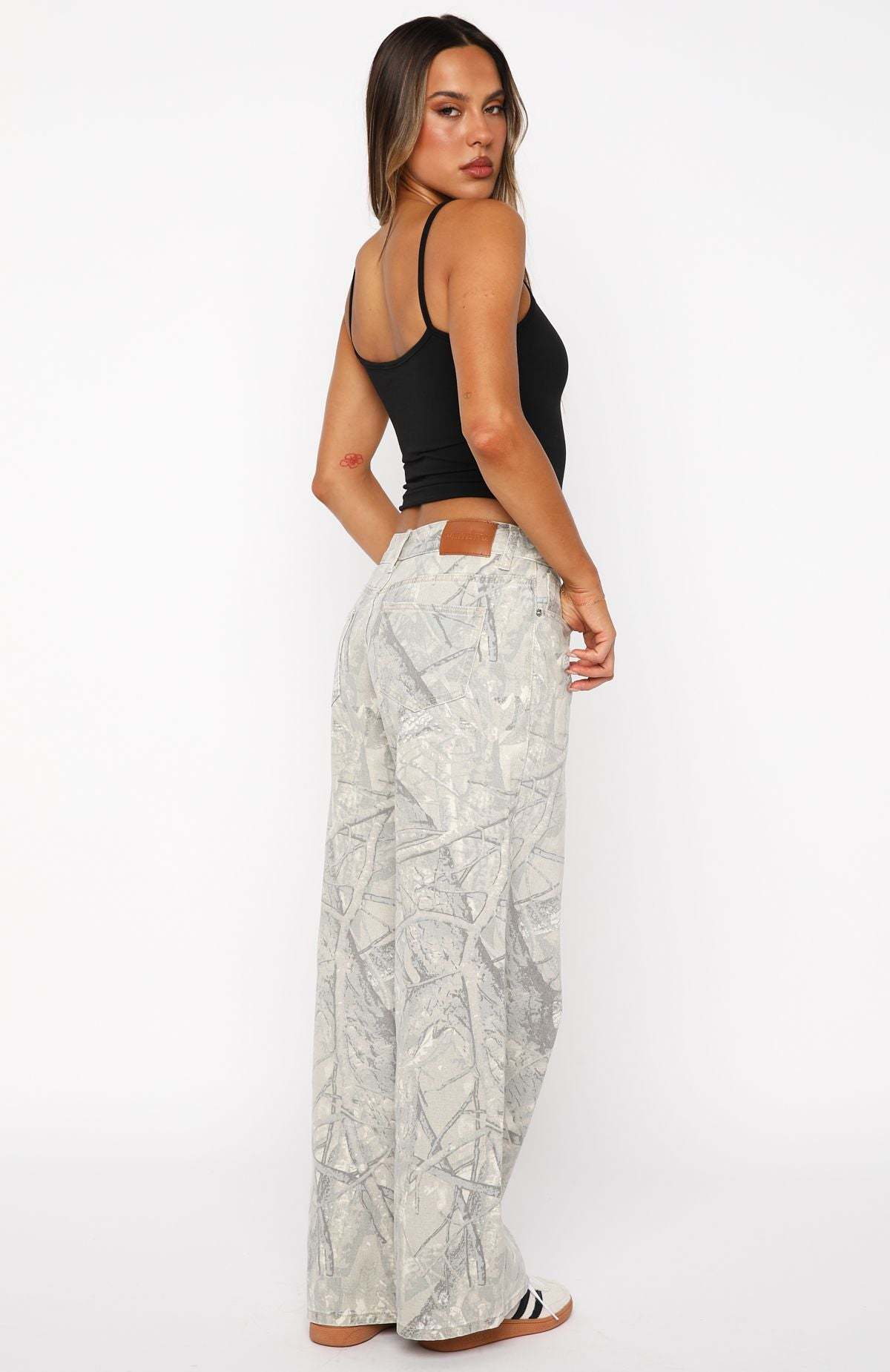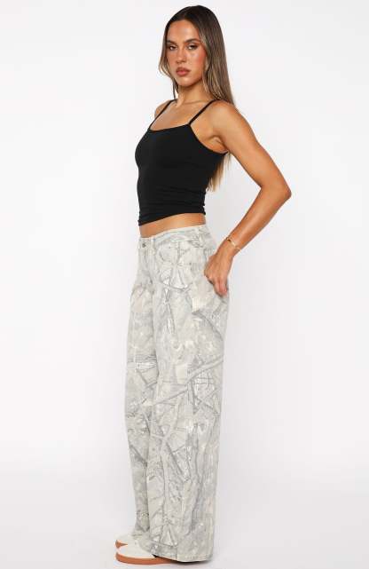 No festival wardrobe’s complete without the Maeve Low Rise Wide Leg in Sand Camouflage. With its low-rise fit and wide-leg silhouette. It’s built with a front button‑and‑zipper closure, belt loops, five-pocket design, and faux leather label at the back. Pair it with a fitted tank, chunky boots, and layered gold chains for a look that owns the daylight and the night.