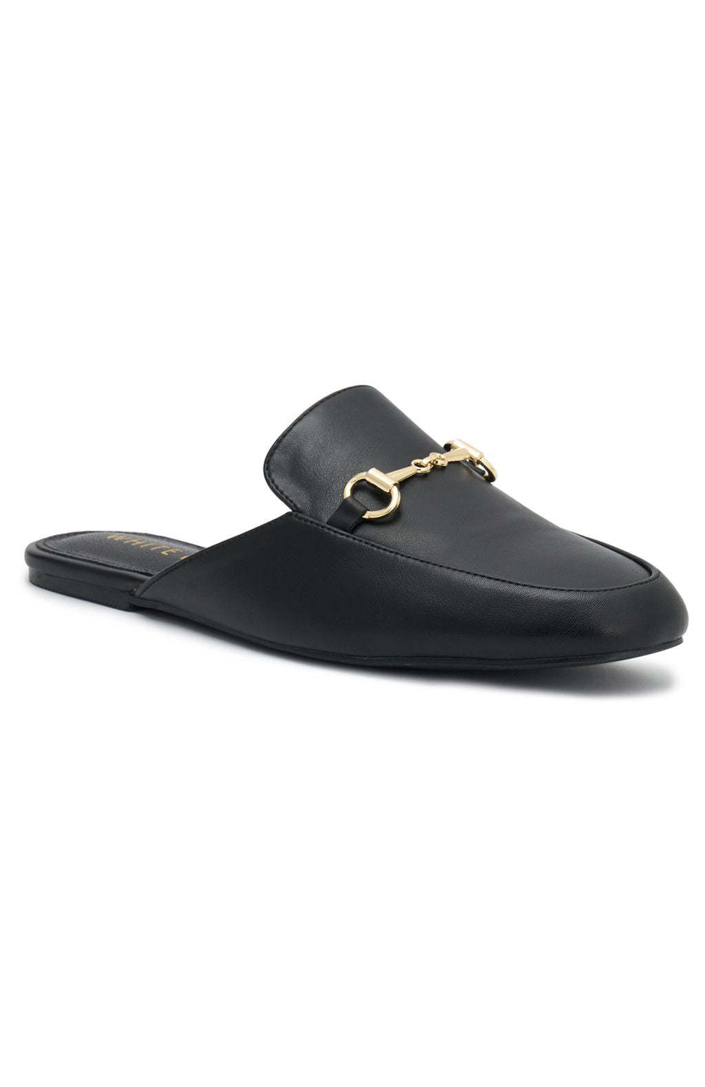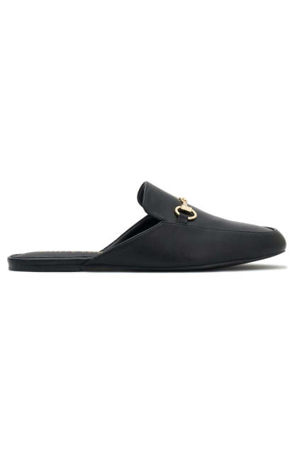 Effortless and chic! The Myles Loafers in Black features a round closed toe, gold hardware detailing across the front and round open back heel. Pair with denim jeans, long sleeve and oversized coat for the perfect cosy winter fit!