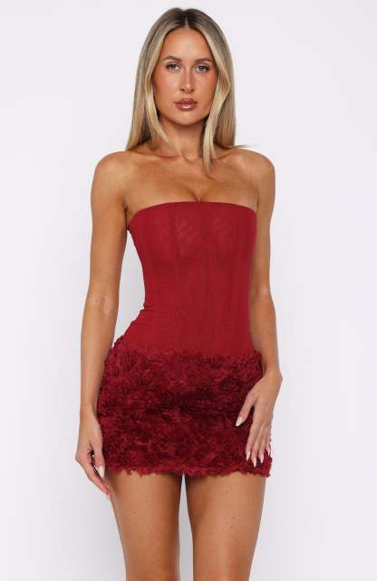 When your outfit says holiday party! The On My Wishlist Mini Skirt Wine features a clean fixed waistband, a rich 3D‑textured fabrication, and a sleek side zipper with hook‑and‑eye closure for a smooth finish. Fully lined and cut to mini length. Style with the Tell Me A Secret Strapless Bustier Wine for effortless festive glamour.