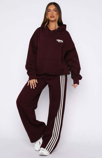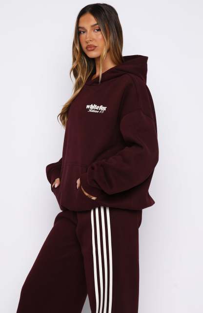 Cozy nights, crisp days in the Release 15 Kiana Oversized Hoodie Plum. Designed with a double lined hood, slouched shoulders and firm ribbed hems which round out an oversized silhouette. Featuring long sleeves, a roomy front pocket, and an unlined fleece interior, this hoodie delivers a cozy feel. Finished with White Fox puff print text side front. Style with the matching Release 15 Asalia Wide Leg Sweatpants.