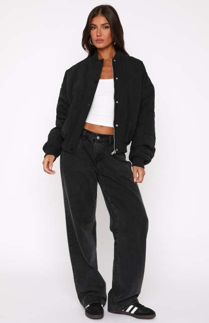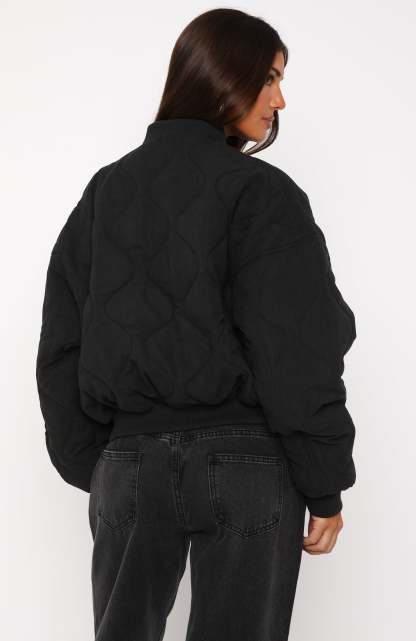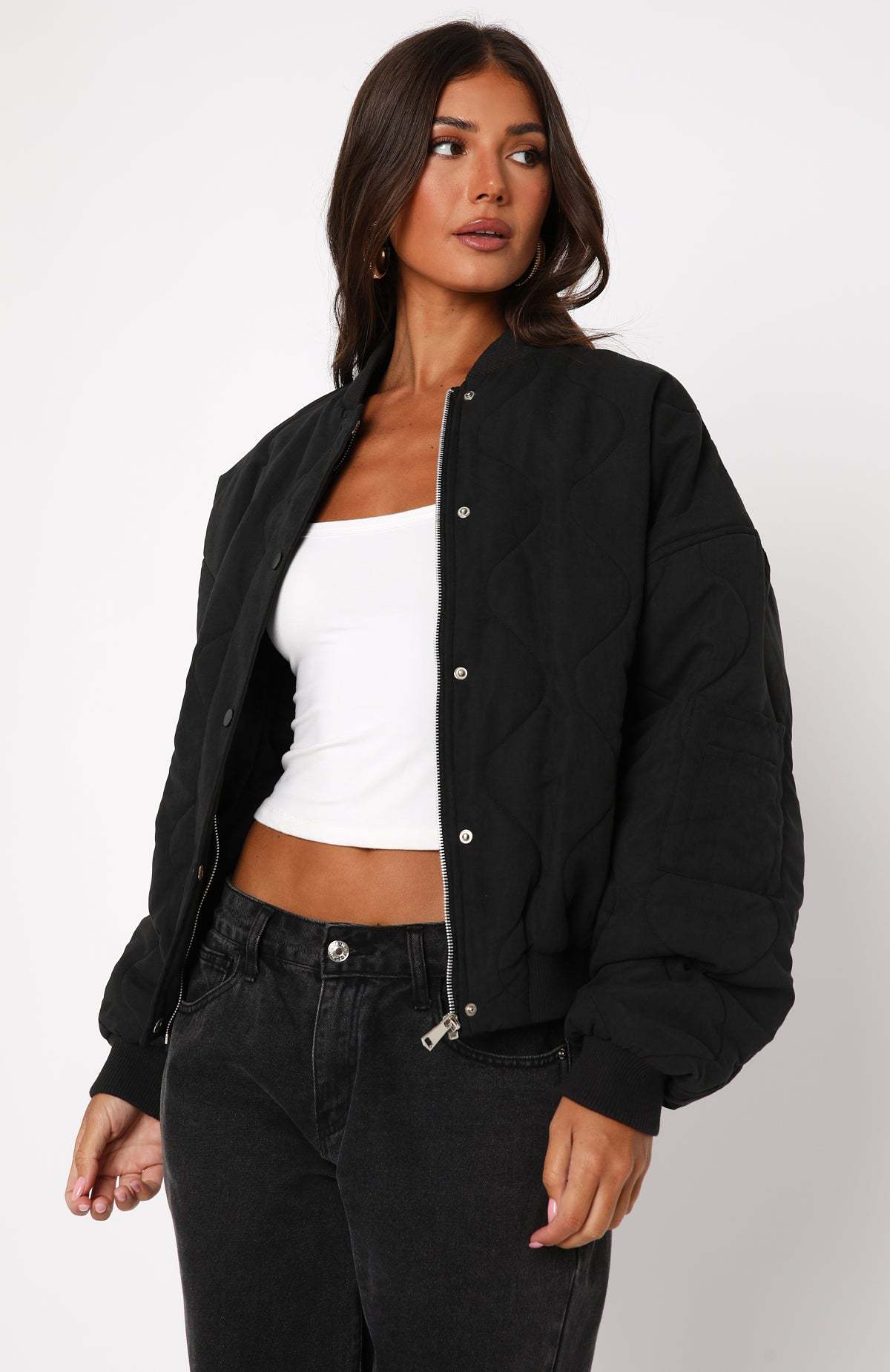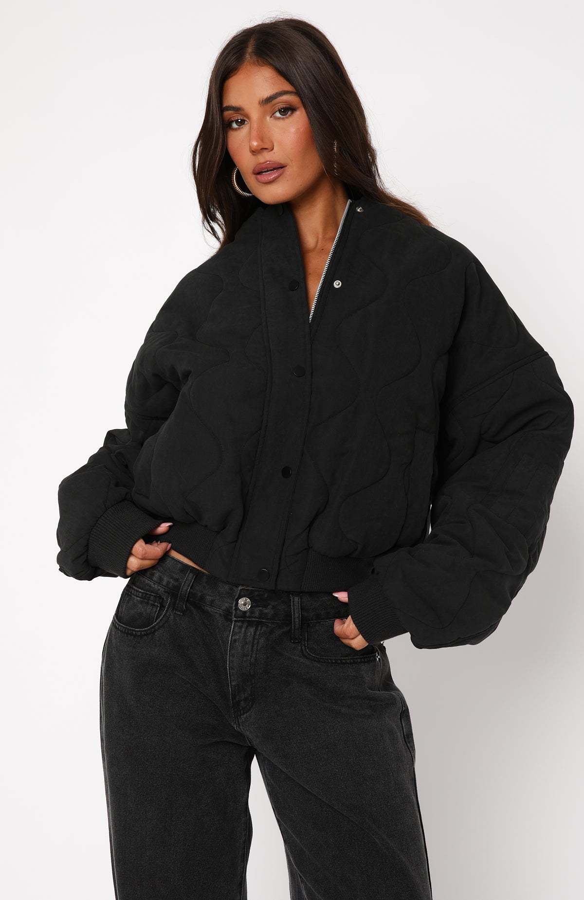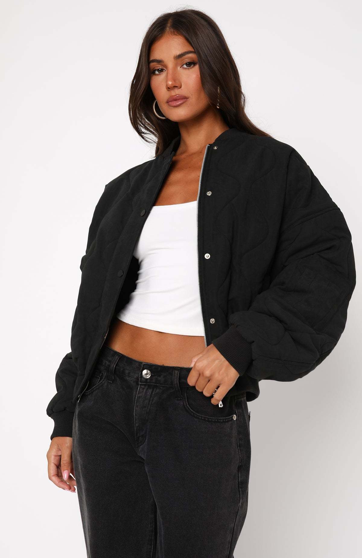 Get ready to fall in love with the Soft Love Bomber Jacket Black this winter season. Featuring a ribbed neckline and cuffs, front snap fastener closure, slouch shoulders, oversized fit, two front pockets and lined, quilted fabric.