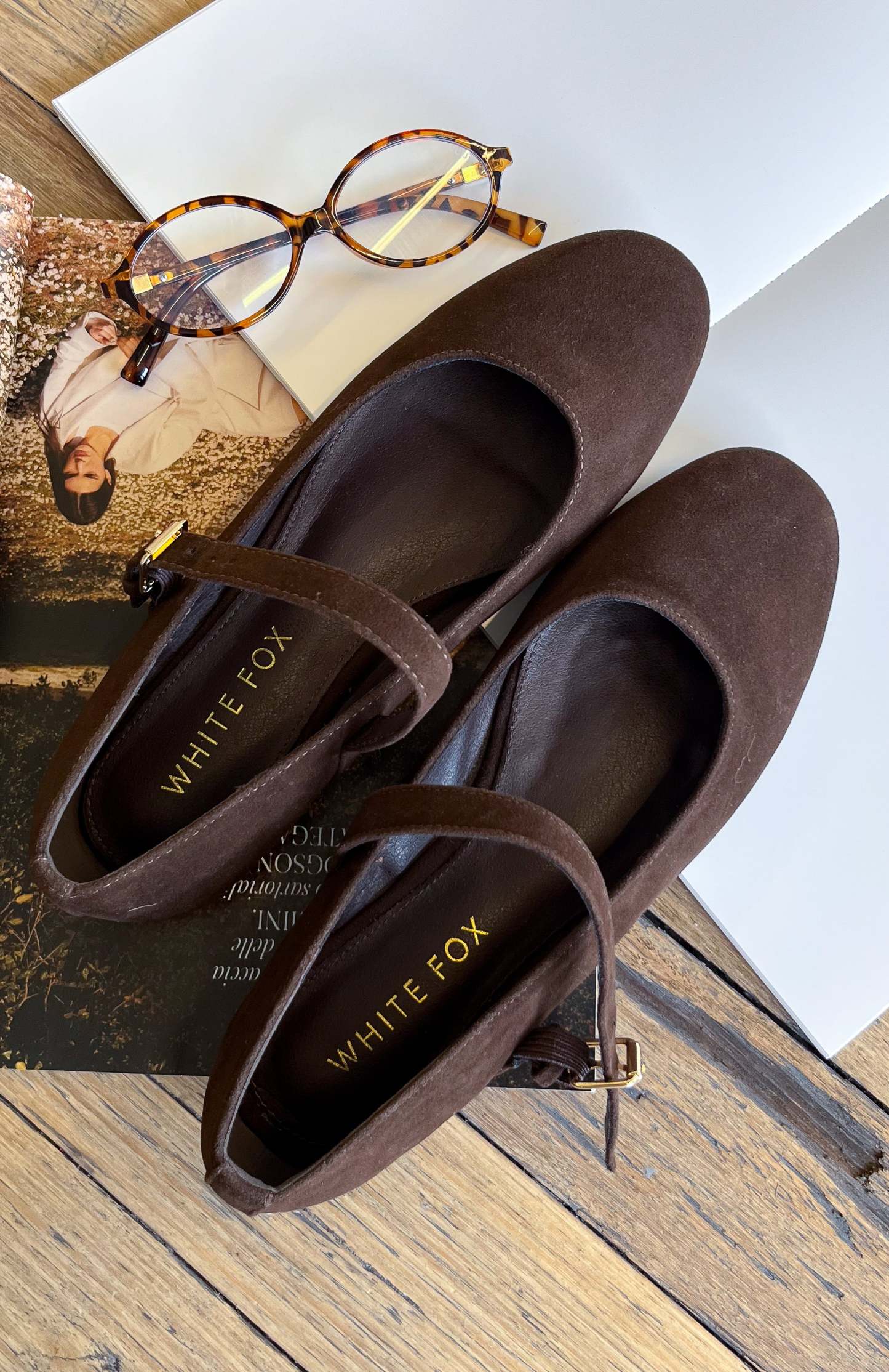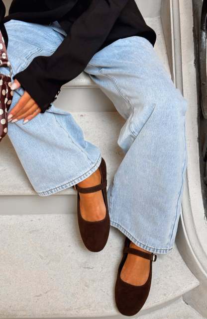 Elevate your everyday elegance with the Tayla Ballet Flats in Chocolate Faux Suede These flats feature a timeless closed round toe, a delicate strap across the vamp, secured with an adjustable gold buckle and closed heel counter. We’re absolutely obsessed with this versatile piece that effortlessly combines comfort and style.