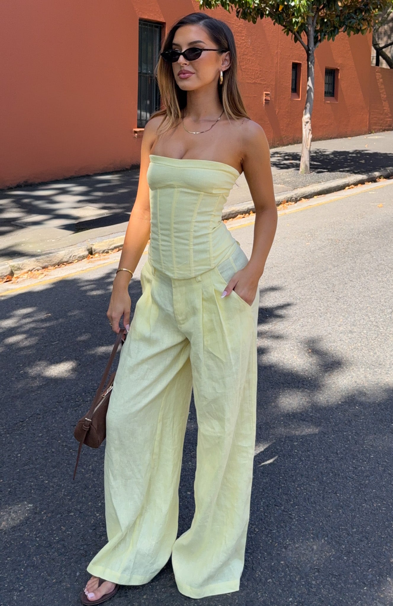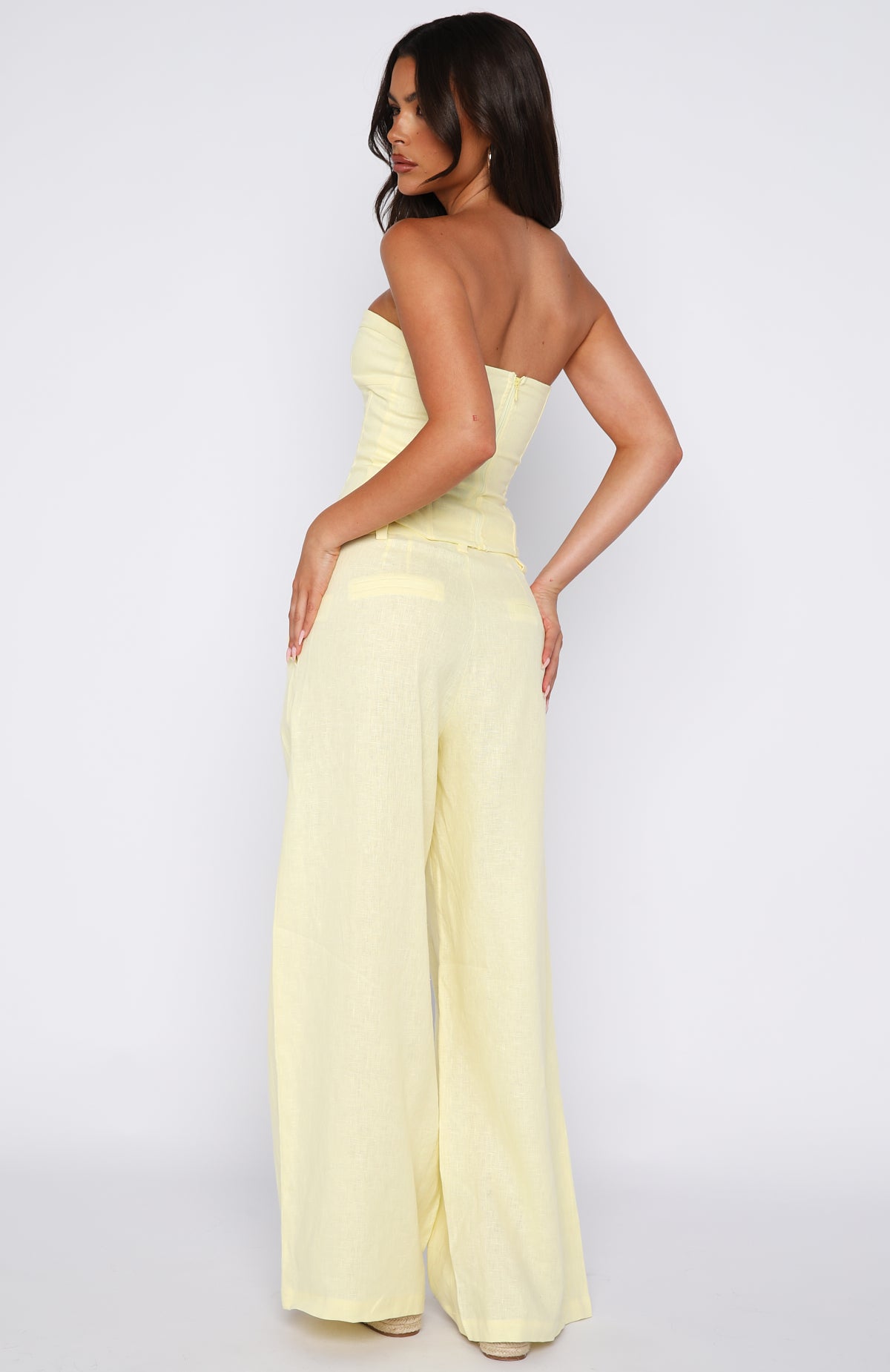 Get summer ready in the Unfinished Feelings Pants White! Features a fixed waistband and double hook‑and‑bar closure teamed with a zipper and button closure. Belt loops frame the waist, while functional side pockets and faux back pockets bring thoughtful detail. The wide‑leg silhouette flows effortlessly, and the unlined fabric offers graceful movement. Style them with the coordinating Downtown Pulse Strapless Bustier and sleek heels for an elevated summery look.