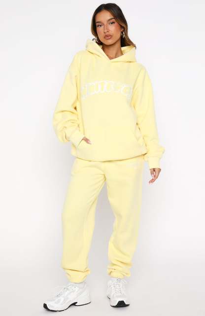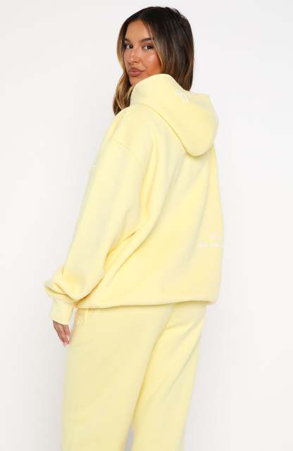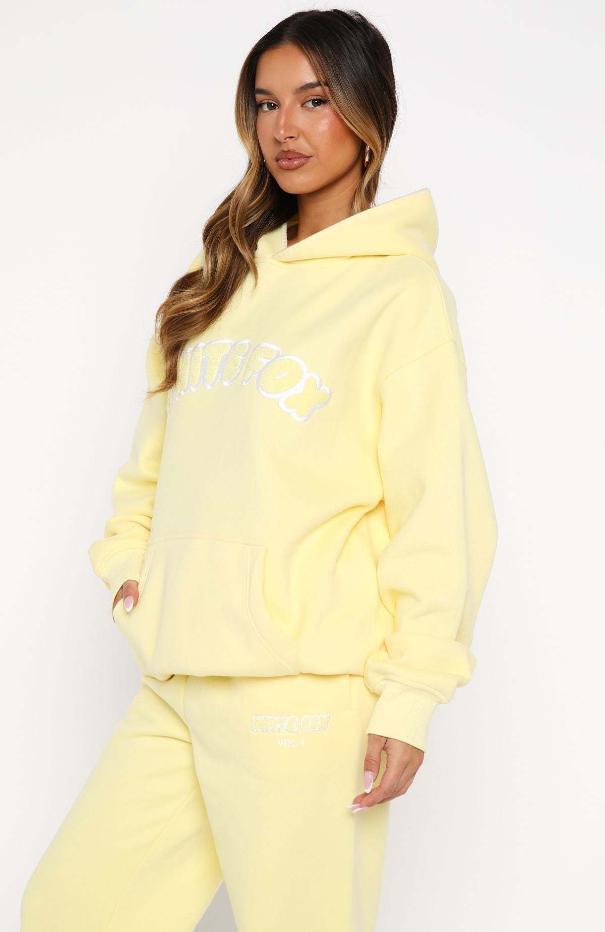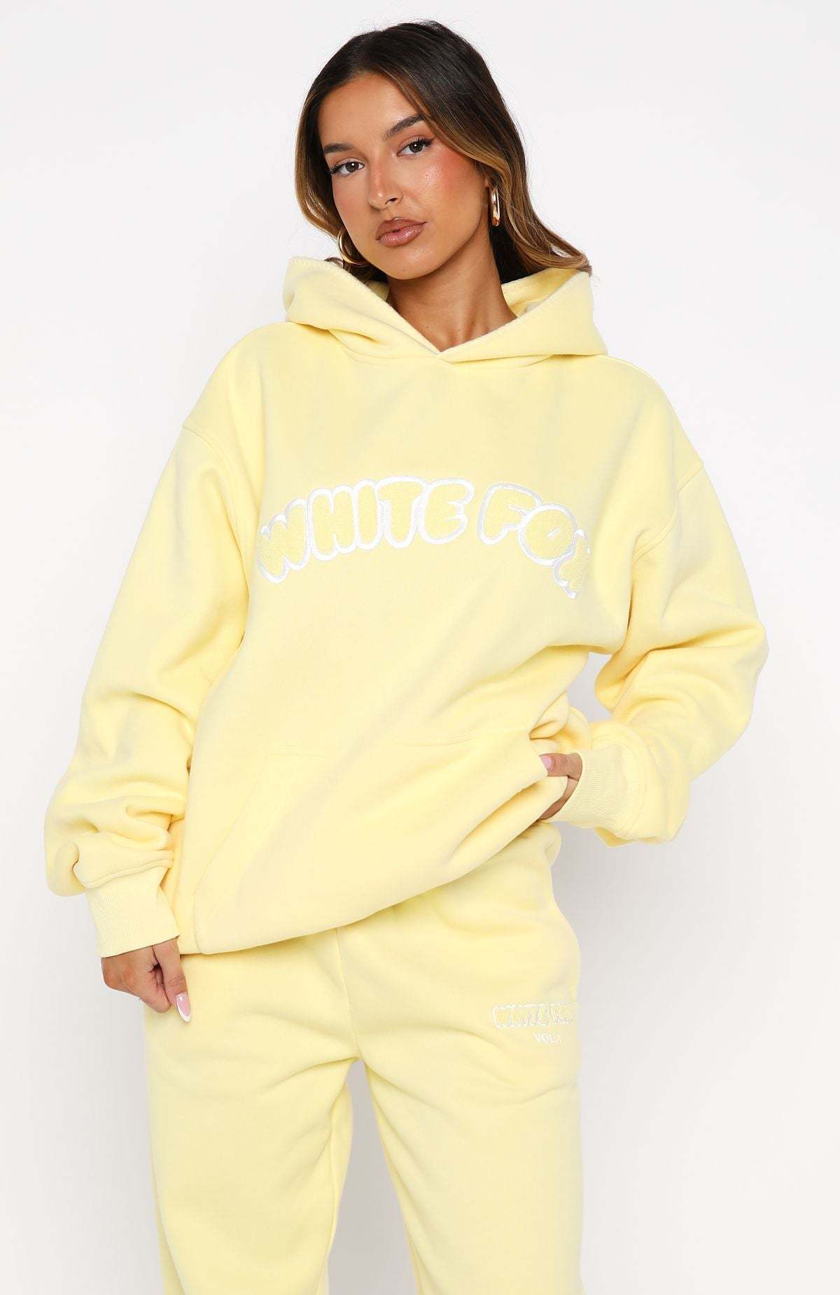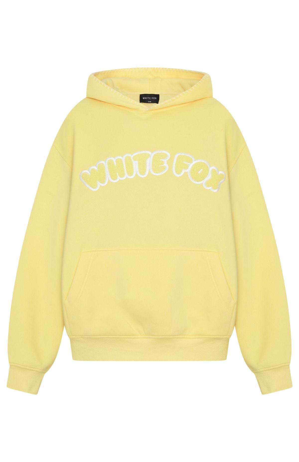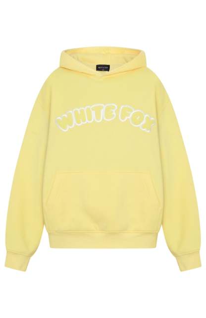 Unwind in style. The Vol. 1 Front Graphic Oversized Hoodie Lemon features a relaxed double-lined hood with exposed stitching, slouched shoulders and ribbed hems, which round out an oversized silhouette. Featuring long sleeves, a roomy front pocket, and an unlined fleece interior, this hoodie delivers a cosy feel. White Fox borg text embellishes the centre front, paired with a printed "made with love" text side back. Style with the Vol. 1 Sweatpants Lemon for a chill weekend fit.