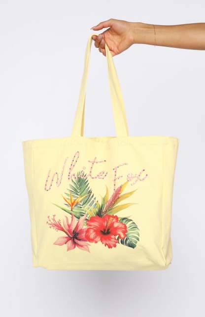 Add a bold burst of sunshine to your summer outfits with the Lemon Wild Dreams Tote Bag. Crafted for sunshine-filled days, this playful accessory features two thick shoulder straps and a spacious interior—perfect for stashing your beach towel, sunscreen, snacks, and more. The front features “White Fox” text detailed in shimmering sequins, framed by a vibrant floral graphic right at the centre. It's the ideal statement piece to elevate your seasonal style.