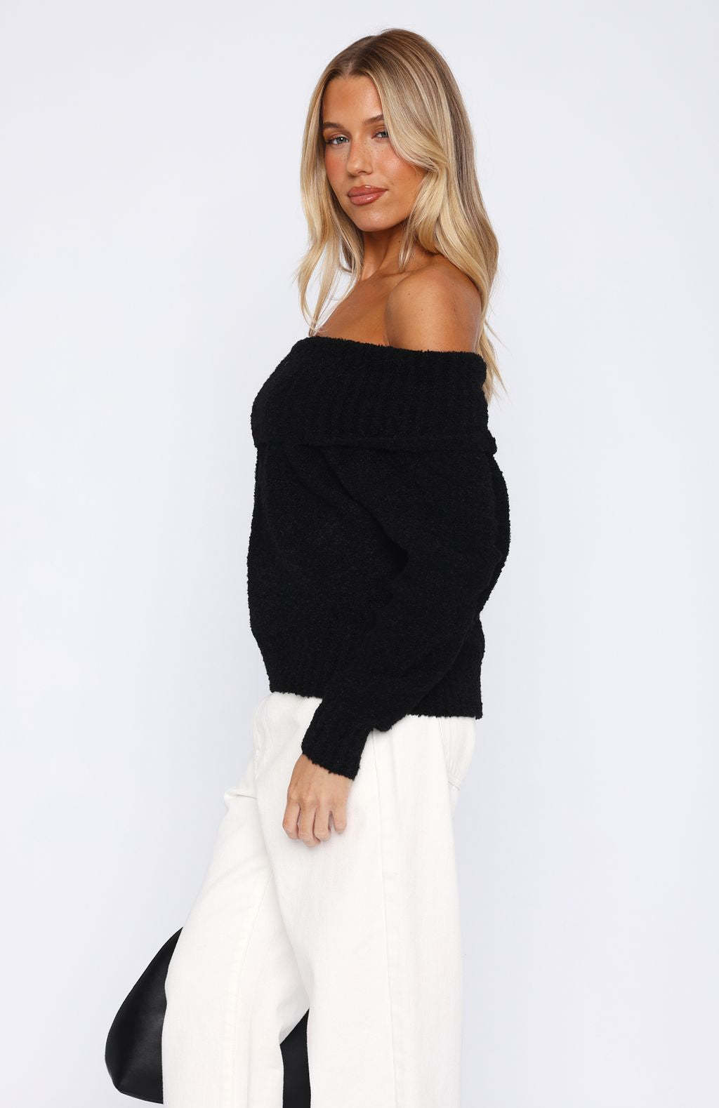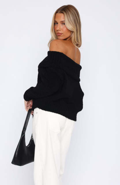 The winter warmer you didn't know you needed! The You Don't Need Me Off Shoulder Knit Sweater in Black features an off the shoulder design with folded over detailing, ribbed hem and cuffs, long sleeves, unlined fuzzy, cosy material. Contrast with off white denim jeans and black heels for a cute and cosy date night fit!